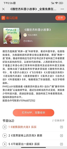 2023年11月1日,黄岛区老科协与区广电FM92.6频道专业录制的科普小百科《魏世杰科普小故事》在喜马拉雅上线,同时还在FM92.6公众号设置了专栏。这些系列科普小故事来自《魏世杰科普丛书》,由黄岛区老科协策划编辑、中国海洋大学出版社出版,语音版上线旨在通过更大媒体,发挥魏老的科普影响力,为大众特别是青少年讲好科学故事,种下科学种子,提高全民科学素质。
