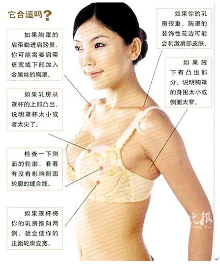 A、B、C、D、E、F…… 这不是字母,这是关呼女性(甚或男性)日常生活需了解的知识 ———中国女性罩杯调查 罩杯 ———一个浪漫的计量单位 90年前,一个无从考证的法国人(专业的说法应该是胸罩设计师)发明了罩杯一词。 今日无数女性的日常必需品,前身叫紧身衣(Corset),在18世纪时就已出现,当时妇女穿它以保持体态。但因Corset非常不舒服,后逐渐演变成分下两件(束胸及束腹),再经过巴黎设计师们的巧艺,式样愈来愈简单,终于演变成今日的胸罩和束裤。 不过,胸罩惊人的款式变化还是近一二十年才有的。胸罩简称为bra,源于法文。在法国人发明胸罩的同时,也确定了由此衍生的胸部或乳房大小的单位———CUP(罩杯)。 CUP,这么浪漫的计量单位也只有法国人想得出来。 法文原来也是可以“象形”的。因为胸罩除了带子,就剩下两个像杯子一样罩在胸部的罩子;由罩杯的大小来测量乳房的大小,既简便又清楚。 罩杯的尺寸由其深度决定。乳房最高点的乳围(三围之一)减去乳房下围一圈的长度,所余尺寸就是你的CUP(罩杯)了: AA=7.5cm ; A=10cm ; B=12.5cm ; C=15cm ; D=17.5cm E=20cm ; F=22.5cm ; G=25cm ; H=27.5cm ; I=30cm 两种罩杯之间的尺寸则以够长的背扣来解决。另外,胸罩也因不同的罩杯,分出了各种不同的式样。 全罩胸罩:可以将全部的乳房包容于罩杯内,具有支撑与提升集中的效果,是最具功能性的罩杯。任何体形皆适合,尤其适合乳房丰满及肉质柔软的人。 3/4罩杯胸罩:在四款胸罩中,集中效果最好,如果你想让乳沟明显地显现,选它一定没错。任何体形皆适合。 1/2罩杯胸罩:利于搭配服装,通常可将肩带取下,成为无肩带内衣,适合露肩的衣服。 5/8罩杯胸罩:与3/4罩杯非常相似,适合胸部小巧玲珑的女孩,更显丰满。 作为女人,数学不好没什么要紧,但下面这个计算公式无论如何要记住,否则麻烦就大了: 罩杯尺寸 = 胸围 -下胸围。 符合中国审美标准的胸围 1.国人大多认为半球形、圆锥形的是属于外形较理想的; 2.两乳头间距离在22~26厘米之间,微微自然向外倾; 3.微微向上挺,厚约8~10厘米; 4.乳晕大小不超过1元硬币,颜色红润粉嫩,与皮肤有明显的分界线,婚后色素沉着为褐色; 5.乳头应突出,不内陷,大小为乳晕直径的1/3; 6.中国女性完美胸围大小与身高的关系为: 身高×0.53 (即适于:胸围=身高×0.53 关系) 按此计算: 胸围÷身高(厘米)≤0.49胸围 太小 胸围÷身高(厘米)=(0.5-0.53) 标准 胸围÷身高(厘米)≥0.53 美观 胸围÷身高(厘米)>0.6 过大 正确佩戴胸罩7步骤 步骤一:上身向前45度倾斜,让胸部进入罩杯; 步骤二:双手握住胸罩边带滑向身后扣上背扣; 步骤三:调整乳头位置于罩杯尖端(这很重要,还要看内衣是欧式设计还是亚洲设计,尖端位置要找准,长时间不注意这个的话可能会导致乳房变形甚至乳头凹陷); 步骤四:站直再调整,将外露的肌肉拨入胸罩内; 步骤五:以双手调整肩带,留出一指宽; 步骤六:将两侧边带拉平无皱; 步骤七:做整体检查,腋下是否有副乳,背后是否往上。 检查一下你佩戴的胸罩合适吗?(见图):