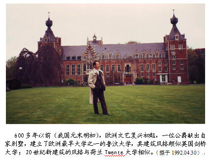 1990年初,按国家教委的要求,我发信与欧洲国家的大学联系,申请为期6个月的访问研究,经费来自世界银行贷款。不久,我先后收到比利时Mons理工学院语音信号处理实验室Boite教授和荷兰Twente大学计算机视觉实验室Houkes(豪克斯)主任的邀请。我先去了荷兰,那纯属偶然;也谢天谢地,否则我很可能不会有后来的收获。在荷兰工作期间,再次收到Boite的邀请。在圆满完成了在荷兰的工作后,我去了比利时法语区的Mons(蒙斯)市。Mons理工学院很一般,但是,这个“语音信号处理实验室”却闻名欧洲;Boite教授的著作,开创了该领域法语书籍之先河。在这里,我了解了欧洲在该领域的研究现状,获益匪浅。