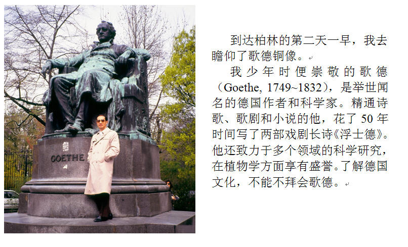 |  我少年时便崇敬的歌德(Goethe, 1749~1832),是举世闻名的德国作者和科学家。精通诗歌、歌剧和小说的他,花了50年时间写了两部戏剧长诗《浮士德》。他还致力于多个领域的科学研究,在植物学方面享有盛誉。了解德国文化,不能不拜会歌德。 |