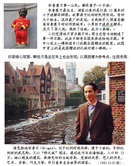 在欧洲,圣诞节和元旦连成一个长假;10月5日是比利时交通节(又称火车节,车票半价),都是我们出游的好机会。我的签证仅在荷、比、卢三国旅游有效,所以,1990年圣诞节期间,我们几个“准单身”相约,从荷兰出发,首次出游比利时和卢森堡。尽管那几天阴雨绵绵,我们还是兴致勃勃。