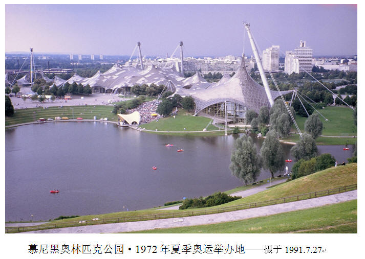 我去的时候,柏林墙已经只剩下几段,供游人观赏考察。那附近,还有一个小型展览馆,展示一些相关的历史证物,销售各种纪念品(包括前苏联军需品)。尤为引人注目的,是那些年前民主德国居民偷越柏林墙的各种奇特方法与工具——包括空中、地下、车辆改装等的展示。 柏林墙于1961年开建,约155公里长,3至4米高。1989年11月9日,开放东西柏林、东西德分界线的浪潮冲垮了它。当时,民主德国居民顷刻像潮水一般涌向西柏林和联邦德国各地。我站在柏林墙边,沉思着那深深影响了几代人的一段历史。 站立高处,你举目可见东西柏林市容的明显差异。那年,我还读到如下报道:东西德合并后,西德企业界组团考察东德工厂,确认有70%设备要报废!——啊,天啦,我以前一直认为前东德工业与技术很先进!……是啊,这里面藏着东欧巨变的必然性。 晚上坐火车离开柏林那天,刚好是星期五。与我用英语交谈的那几个柏林年轻人,也是为节约时间和钞票,坐夜车到南方风景区去度周末。27日晨,到达慕尼黑。以我拙见,慕尼黑有两处最值得光顾。一是慕尼黑奥林匹克公园,二是国家科学博物馆。 慕尼黑奥林匹克公园,是1972年第20届夏季奥运举办地。这个高度集中的大型体育建筑群,离市中心仅4公里,是市民们最佳的运动场所。它有33个体育场馆,包括可容纳8万名观众、可住12000名运动员的奥运村。一眼望去,那50根柱子吊起几张“鱼网”,是当时世界上最昂贵、最大的帐逢式屋顶,建筑史上的首创。环形看台的2/3在地表之下。足球场下面有暖气设备,保证一年四季绿草茵茵。丰富的光影变化,让看台上的人们如置身于美丽晶莹的艺术世界。 从290米高电视塔上俯视,曲曲弯弯的人造湖,林木茂盛的小山,大片的草地清晰可见;在阳光下闪烁的鱼网屋顶,真像渔夫刚从水中提起的鱼网。更远处,可鸟瞰慕尼黑全城,直到阿尔卑斯银色峰峦的秀丽景色。