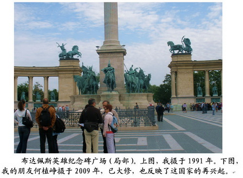 4月11日,由博士生傅昭铭兼任领队、导游和节目主持人的“东欧之旅”开始了。大巴从布鲁塞尔出发,沿高速公路飞驰,穿越德国去奥地利。我再一次观赏那令人陶醉的德国优雅农村,秀丽河流,丘陵起伏的绿油油田野。路上,有相声天赋的小傅,把旅途搞得十分和谐、愉快。车上5个电视屏,有时播新闻、放故事片;休息时很安静,娱乐时很欢快。除了来自温州的小黄以外,所有人都大大方方上车前拿起麦克风唱歌、说笑话、讲故事。他们对大陆的歌、乐曲和文艺界人物(张艺谋、李谷一、刘晓庆等)都相当熟悉和喜爱,称“中华文化的根子在大陆”。中华文化展示了强大的凝聚力。