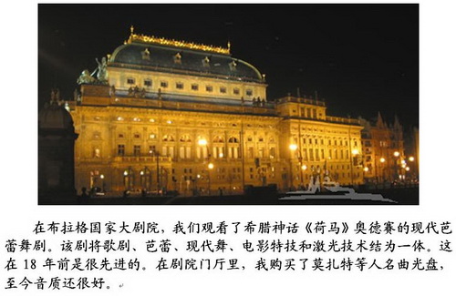 在布拉格国家大剧院,我们观看了希腊神话《荷马》奥德赛的现代芭蕾舞剧。该剧将歌剧、芭蕾、现代舞、电影特技和激光技术结为一体。这在18年前是很先进的。在剧院门厅里,我购买了莫扎特等人名曲光盘,至今音质还很好。 |