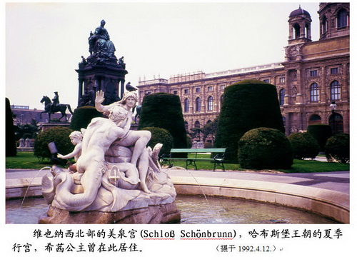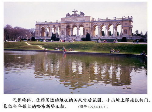 气势雄伟、优雅闲适的维也纳美泉宫后花园。小山坡上那座凯旋门,象征当年强大的哈布斯堡王朝。 (摄于1992.4.12.) |