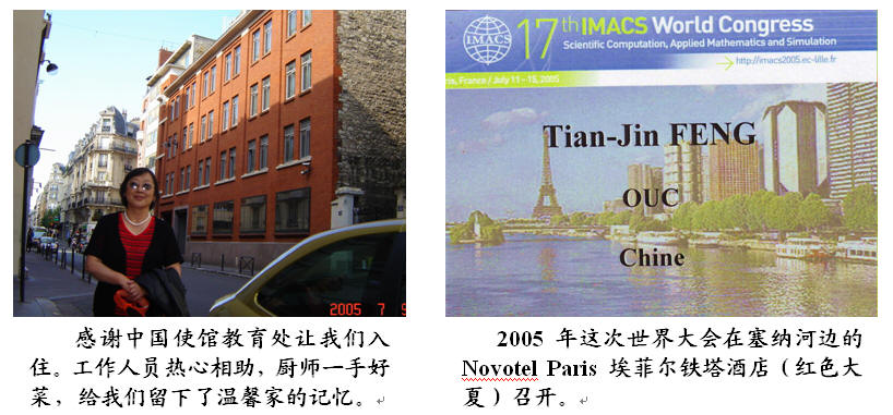 2005年,通过网上联系,我们有幸住入中国大使馆教育处Glaciere街29号。那是条小街,离地铁很近,十分方便。工作人员亲切友好,厨师做得一手好菜,吃饭的人最多时也不过20。傍晚散步,还吃过他们种在庭院花盆里的草莓,颇有家的温馨。IMACS 会议的组织者之一、清华大学毕业的博士、法国ENSAIT纺织学院曾宪义教授,也为我们提供了方便。在巴黎攻读博士学位的梁小姐,课余在旅游公司打工,百忙中也给予我们热情的帮助。