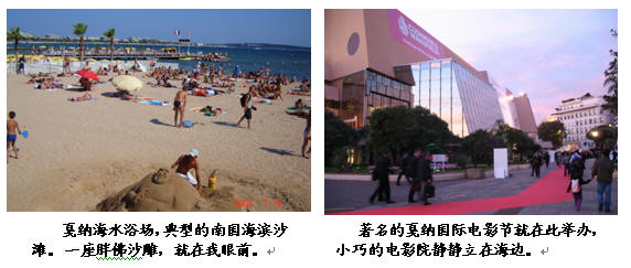 我们火车通票的“第一趟(次)”,是早晨从巴黎出发,穿越大半个法国,下午到东南部城市尼斯(Nice);在连锁旅店IBIS安顿下之后,再上火车,往返于举世闻名的地中海北部“蓝色海岸”。这一带,有天水相接的蓝色,还有极怡人的气候,一直是疗养与度假的胜地。我们造访了这一线的另两个亮点:国际电影名城戛纳(Cannes)和世界第二小国摩纳哥(Monaco)。那是阳光明媚的7月中旬,在纬度高的法国,白天很长,有充足的游览时间。