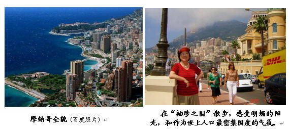 摩纳哥,法国东南角、地中海沿岸的一个小公国,世界上不多的“国中国”、“国城一体”之一。其面积约为上海世博会占地的一半,1.95平方公里,其中约0.4平方公里为填海造地,人口却有3万多,地窄人稠。