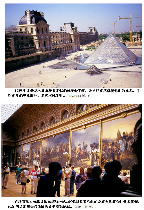 卢浮宫蕴藏着从公元前8000年至1848年(跨度约一万年)的精品,可谓全球艺术百科全书和灵感源泉。其建筑既具中世纪城堡的雄姿,又有文艺复兴的豪华,1981后又进一步现代化,有了入口的金字塔和地下服务空间。内容越来越丰富,目标越来越大,效能越来越高。如果你提前看些资料,有准备再进卢浮宫,收获会大得多。你若想对它有所深入,像我1992年那样,中午在馆内吃一次快餐,参观一天。自己去,门票也仅8.50 欧元(2005)。