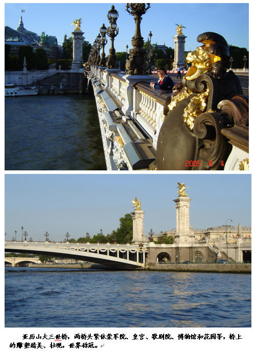 世间名城,多依河或海而立。然而,我不知道有哪个城市,能坐船览阅如此多样、古雅辉煌、现代宏伟、传奇浪漫的景点与建筑。我1992年一次,2005年陪老伴再游,会议组委又特邀,3次登船畅游,乐见不厌。巴黎的多数著名景点,巴黎圣母院、卢浮宫、奥赛博物馆、埃菲尔铁塔、夏乐宫、大学、歌剧院、工业宫、国民广场、机械宫、人工艺术创造院等,顺延塞纳河展开,多姿多态的桥梁一个接一个。我遇见一位南京人,他长时间立于游艇边不停拍摄。他解释说:“我喜欢建筑。塞纳河两岸,就是一个欧洲古典建筑的展览会。”