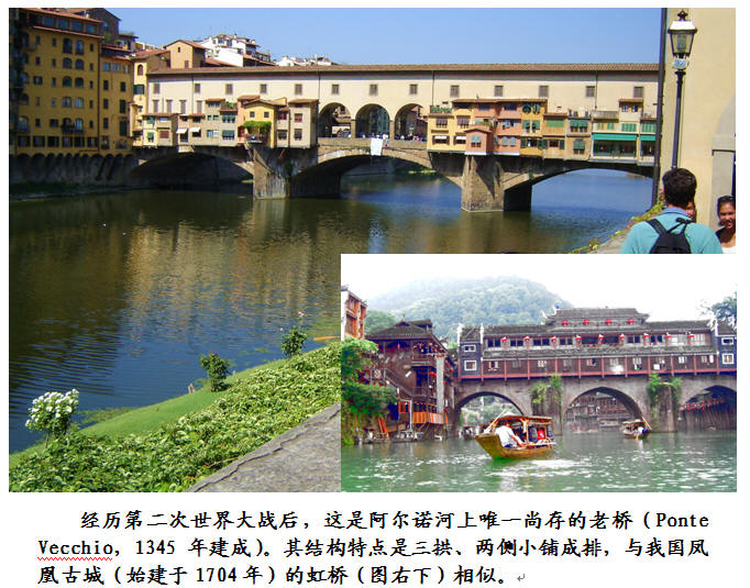 经历第二次世界大战后,这是阿尔诺河上唯一尚存的老桥(Ponte Vecchio,1345年建成)。其结构特点是三拱、两侧小铺成排,与我国凤凰古城(始建于1704年)的虹桥(图右下)相似。 |
