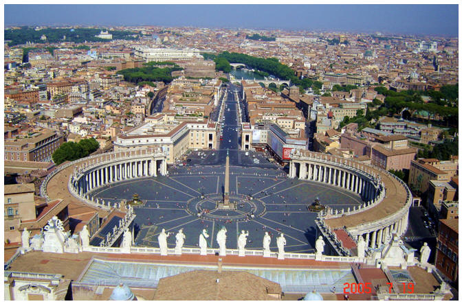 到罗马,已是傍晚。这里属亚热带地中海型气候,比青岛夏季更热,但不闷。住房安顿好后,便散步夜访宏伟的圣彼得广场。