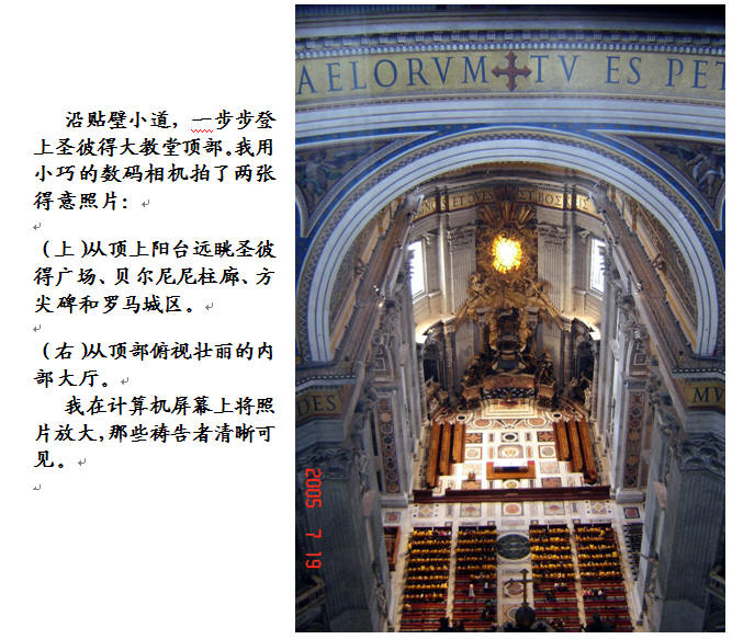 进入大教堂,加入参观队伍,沿紧贴大厅边的狭窄(单人单行)楼梯艰难而上,来到教堂顶部。这是拍照的极佳位置。对于我拍的照片,友人说:你用小数码机拍出这样的照片,一点也不比街上的明信片差。