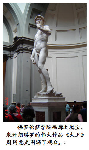 记得,即将离开佛罗伦萨时,在车站上遇上一对从外地长途跋涉来参观美术馆的意大利中年夫妇,女的是中学教师。她说:《大卫》,太精美了。我盯着它看,激动得流了泪!这话让我反复思索:在《大卫》面前,我们也很振奋,却并无要流泪的感觉。是文化差异所致?
