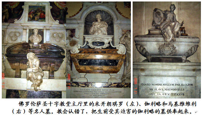 有显赫大圆顶的主教堂(Duomo)、彩色大理石镶嵌的哥德式的圣十字(Santa Croce,又译为圣可罗切)教堂、乔托钟楼(1334-1359)等,都是许多艺术家几个世纪创作的结晶。圣十字教堂大殿,安放着精心修饰过的许多名人的墓碑,实验科学奠基人伽利略(Galileo, 1564-1642)、米开朗琪罗和誉为“政治学之父”的马基雅维利(N. Machiavell, 1469-1527)的墓站住显赫地位。