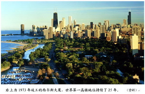 西尔斯大厦(Sears Tower),地上110层,地下还有3层,算上两个线塔则高达520米。整个建筑分成4级,颇有我国民族乐器中“芦笙”的样子。
