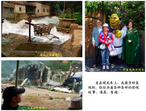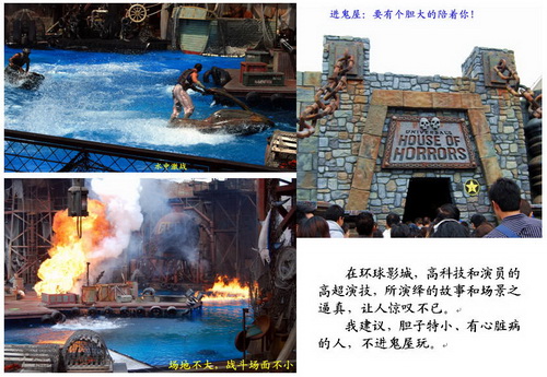 它很像迪斯尼乐园:规模宏大、内容丰富、高技术、巧安排、老少皆宜,游人如织;不同之处在于,它以影视为主题。乘坐游园车,一路体验着生动逼真的电影场景——桥断雪崩、山洪暴发、大白鲨、大金刚等等;回想着好莱坞大片《回到未来》、《侏罗纪公园》、《外星人》、《蛮荒西部》……,仿佛身临其境,令人叹为观止。