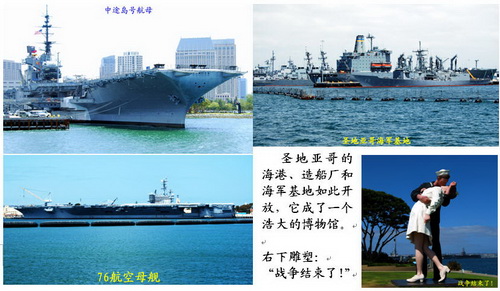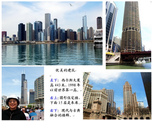Diego)和它的海湾,很美。而且我想,世界上不大可能有别的地方,让人们惬意地坐在游船上浏览如此众多的军舰、船舶、造船厂。立在美丽海滨的雕塑“战争结束了”,是《时代》杂志著名摄影师阿•爱森斯泰特一张照片的再现。1945年8月14日日本投降,那一瞬间出现了一个经典:一位水兵热吻身边并不认识的护士沙恩。 圣地亚哥《海洋世界》(SeaWorld Park)公园,可谓相当现代化,精彩非凡。 4. 芝加哥:现代建筑博物馆 好学又能干的小熊和可可(教育学硕士、计算机系统管理师)很忙,周末才能带我们去玩。平日晨,小熊开车到火车站,他急急忙忙坐火车去上班,我们或坐火车、或打的去观光,傍晚在车站把我们接回家。 芝加哥艺术学院、海军码头(Navy