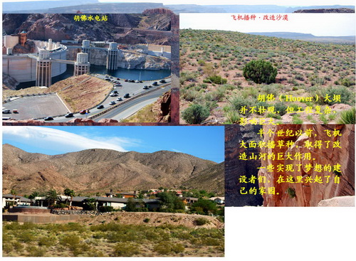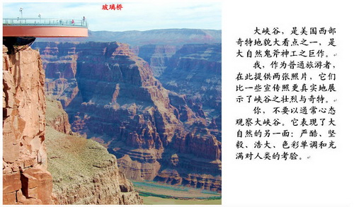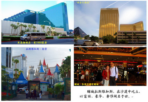 “美国梦”(American Dream),是一种精神与信念,即相信在美国,无论哪个阶层的人,经过努力奋斗,便能获得成功、过更美好的生活。长期以来,世界各地的移民,都抱著这个理想来到美国。美国人也以此为动力和自豪。 洛杉矶的气候属于干燥的亚热带天气,路边常见到高高的棕榈树。街上行人很少。行人过马路时,需要自己按按钮,人行灯亮起即可通过。和欧洲一样,一般是汽车让人。 2. 拉斯维加斯•大峡谷 上午,穿越北美最大的沙漠(Mojave Desert);下午,到达显赫的沙漠赌城——拉斯韦加斯(Los Vegas)。这里,家家酒店都有赌场。胡佛水库和水电站,为它提供了赖以生存和制造辉煌的水与电。 4月23日,清晨5点起床,穿越沙漠和山坡,10点到了美国西部观光的重点——西大峡谷(Grand Canyon West)和高挂峡谷空中的“玻璃桥”。 名城圣地亚哥(Son