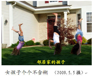 此乃偶遇?不,在芝加哥又遇到了:侄女的孩子会轻巧地空翻,附近邻居家5个孩子个个能侧滚翻。看我要给他们照相,个个精神抖擞,表现各种翻滚动作。在国内,我也常与孩子打交道,没见过如此情景。