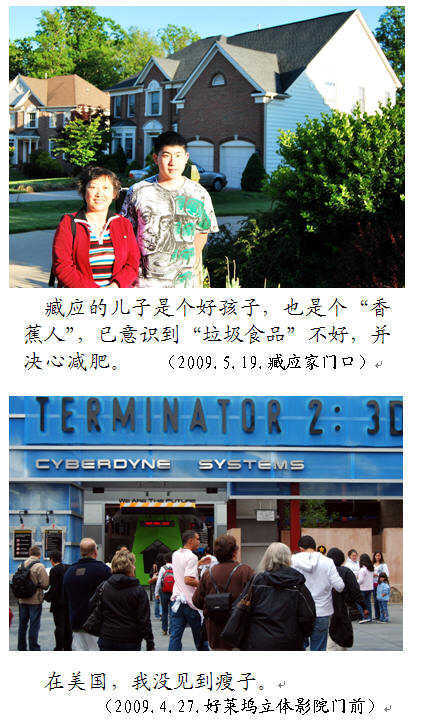 美国人既不同于日本人,也不同于欧洲人。他们工作紧张,竞争激烈,还要过得潇洒。结果,占世界人口5%的3.01亿美国人,消耗掉地球能源的1/4;贪吃“高级-垃圾”食品,热量太高,即使用喝冰水来平衡——不仅饭店、家中常备冰水,连饮水机上也有“冰水”龙头。——还是有太多的胖人。成鲜明对比的是,日本人非常重视饮食卫生,胖子很少。尤其是老年人,可以说没有胖子;有些老太太“瘦得可怜”。所以,日本人平均寿命世界第一。