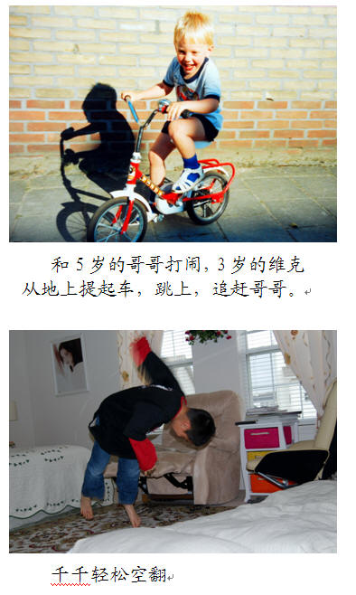 前面谈到一个被我们戏称为“生孩子专业户”的家庭。一次,他们的孩子们在院子里打闹,我看见3岁的维克能够一边提起倒在地上的小自行车,一边推着跑,接着就跳上车去追他小哥哥。我不曾见过、设想过3岁小孩有这样的体能!