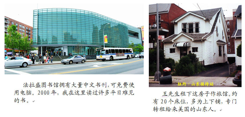 2000年,为省钱,她介绍我到位于纽约长岛西部的法拉盛(Flushing)Barclay 街王先生的“山东接待站”。在那里,我住在一个凉台改成的单间单床上(7天,共110美元)。住在那里的人,多数是“黑人”(偷渡过来),睡拥挤的上下铺。厨房公用,各做各的饭。每天晚上,我观光回来,很乐于和他们交谈。
