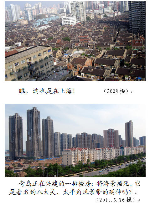 比如,2005年我们从巴黎回到上海,8月7日乘飞机返青岛时,遇上台风‘麦莎’。飞机在青岛上空颤抖、颠簸,无法降落,只得返回上海。机场安排我们入住一个较偏的旅馆高层。我们从窗口目睹了上海另类景象:破旧楼房,大片大片!2008年,我在上海卷烟厂附近再一次面对此情此景。