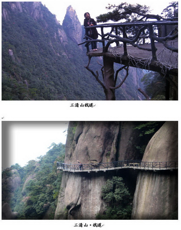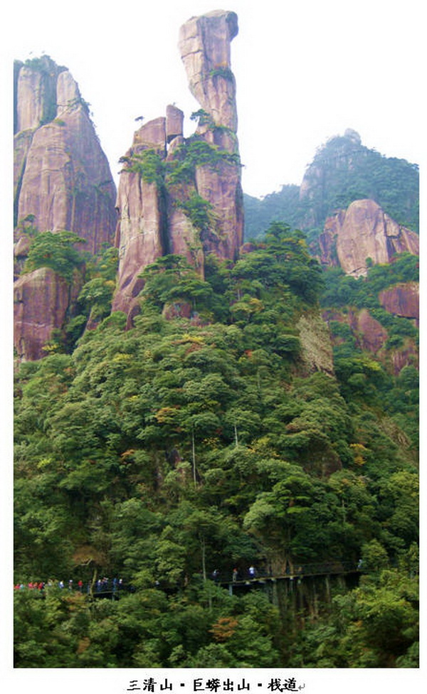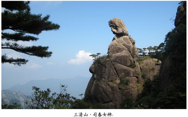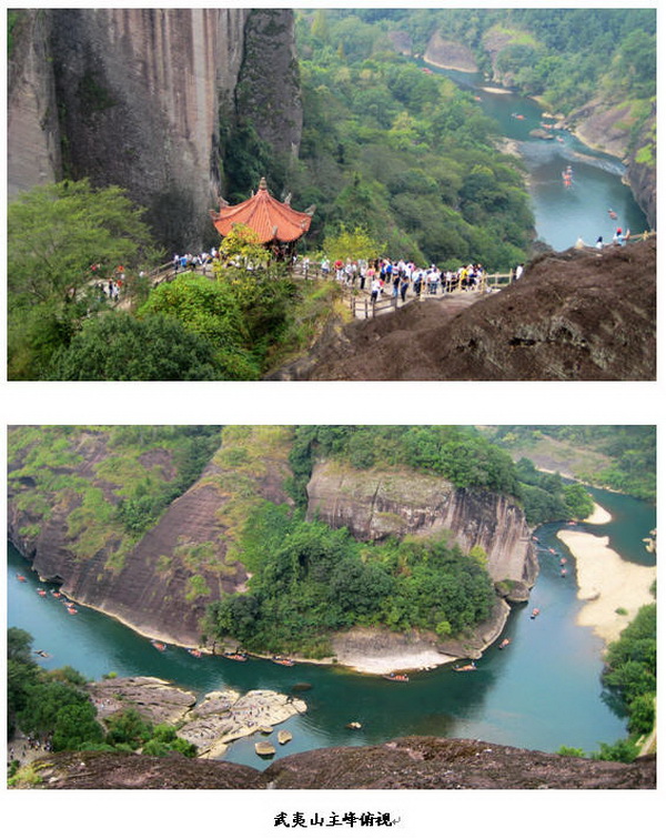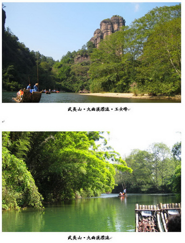 2008年10月中旬,海大退休办组织了景德镇-婺源-三清山-武夷山游,一路美景不断。这里,选些照片与大家分享。 婺源 婺:能文能武的女子;源:水的始出之处。主要景点有:李坑、晓起、彩虹桥、卧龙谷、灵岩洞。婺源乡下的宁静,镜子般的水塘,云样葱茏的绿树,别致的马头墙。 在婺源一县辖内,错落有致的徽式建筑,从千百年前传承下来,新建的房屋也全部按古制建造,形成婺源县内特色鲜明的建筑风格。李坑、晓起村、江湾一带,有保存完好的古建筑,处处巨大的古香樟,千百年前水流至今的绿色小河,水边浣衣的村妇,岸边绿树下水面薄薄的晨曦在一幅画中。 三清山 三清山,黄山的延续山脉。主峰玉京峰海拔1820米,因山有三峰,名为玉京、玉华、玉虚,如三清(即玉清、上清、太清)列坐其巅,故名三清山。 三清山十大绝景:司春女神、巨蟒出山、猴王献宝、玉女开怀、老道拜月、观音赏曲、葛洪献丹、神龙戏松、三龙出海、蒲牢鸣天。 三清山为历代道家修炼地。自晋朝葛云、葛洪来山以后,渐为道学名家所向往。三清山有“露天道教博物馆”之称。 武夷山九曲溪漂流 九曲溪,发源于华东大陆最高峰——武夷山脉主峰黄岗山,全长60多公里,由西向东穿过武夷山景区,盈盈一水,折为九曲,所以得名。现已成为武夷山国家重点自然保护区,保存了地球同纬度最完整、面积最大、最典型的中亚热带原生性森林生态系统。 武夷山,是老三纪红色砂砾岩的分布区,所以叫“丹山”。纵观天下名山,既能观山又能玩水者屈指可数。曲曲山回转,峰峰水抱流。九曲溪是山水和谐之美的典型代表。 虽然老伴65岁,我70,我们还是坚持着,沿着凿在巨大石头上的山崖小道,登上了“天游山”顶,武夷山脉、云窝景区和九曲溪的美景尽收眼底。从山顶鸟瞰,不愧为“天下第一漂”的九曲溪,像一条蓝宝石色彩带,弯弯曲曲镶在群山中。鱼贯小船,缓缓而行,美不胜收。