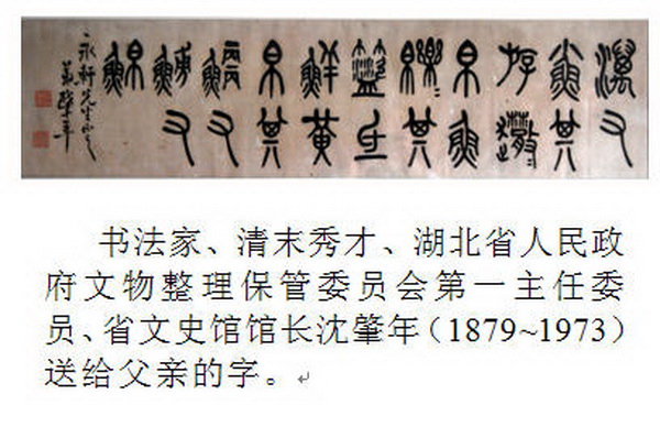 书法家、清末秀才、湖北省人民政府文物整理保管委员会第一主任委员、省文史馆馆长沈肇年(1879~1973)送给父亲的字。 |