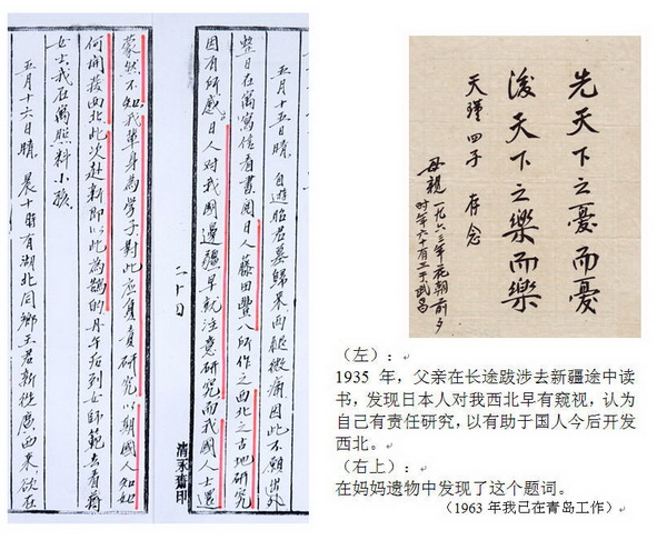 (左): 1935年,父亲在长途跋涉去新疆途中读书,发现日本人对我西北早有窥视,认为自己有责任研究,以有助于国人今后开发西北。 (右上): 在妈妈遗物中发现了这个题词。 (1963年我已在青岛工作)