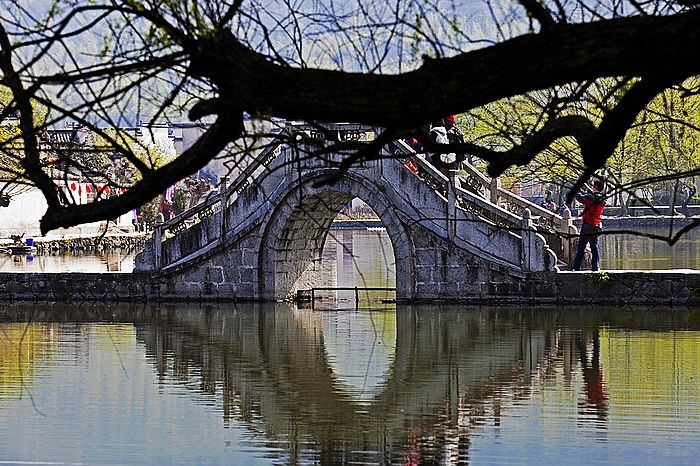 古宏村人规划、建造的牛形村落和人工水系,是当今“建筑史上一大奇观”:巍峨苍翠的雷岗为牛首,参天古木是牛角,由东而西错落有致的民居群宛如宠大的牛躯。引清泉为“牛肠”,经村流入被称为“牛胃”的月塘后,经过滤流向村外被称作是"牛肚"的南湖。人们还在绕村的河溪上先后架起了四座桥梁,作为牛腿。这种别出心裁的科学的村落水系设计,不仅为村民解决了消防用水,而且调节了气温,为居民生产、生活用水提供了方便,创造了一种"浣汲未防溪路远,家家门前有清泉"的良好环境。