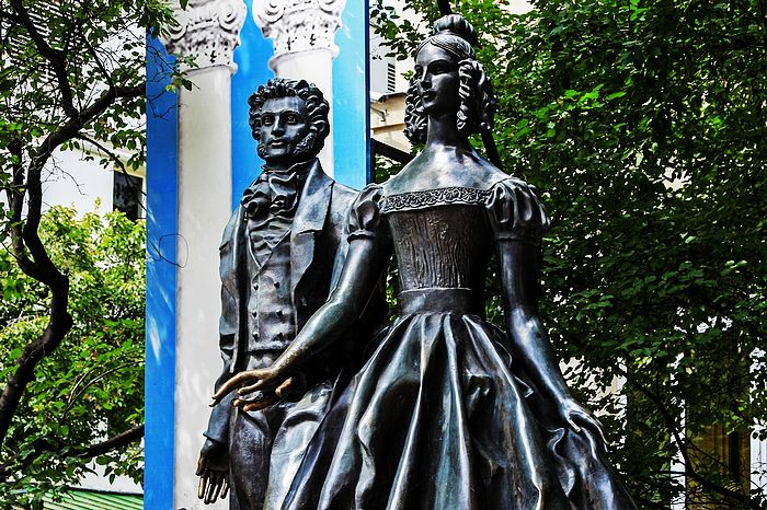 普希金故居(步行街53号)对面普希金与娜塔丽娅携手雕像