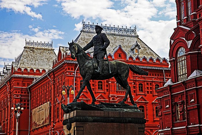 国家历史博物馆前耸立着朱可夫元帅的青铜雕像。朱可夫元帅为抗击和战胜德国法西斯做出卓越的贡献。是我们永远敬仰的反法西斯英雄!