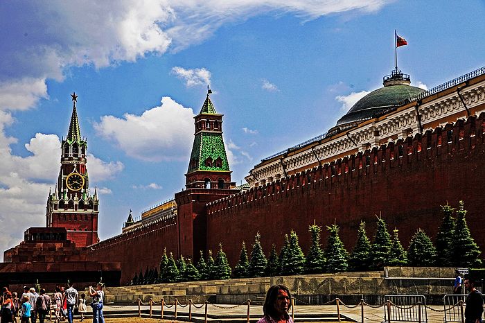 红场西侧的红墙里飘扬着旗帜的建筑就是克里姆林宫里俄罗斯总统办公的地方。
