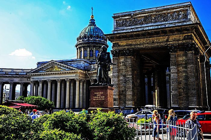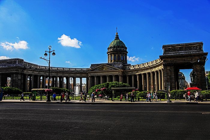 11 喀山大教堂位于圣彼得堡的涅瓦大街上,教堂以罗马圣彼得教堂为蓝本,历经10年于1811年建成。由于教堂的侧面面临涅瓦大街,建筑师在教堂面临大街的一侧树立起94根“罗马柱”,构成长廊,使喀山大教堂称为典型的俄罗斯教堂,教堂中供奉俄罗斯最灵验的喀山圣母像。