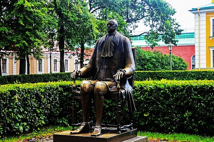 8 彼得大帝墓地前的彼得大帝铜雕像。彼得大帝的头做的很小,身驱很大,形像怪诞,却充满内力。其寓意:一个正确的思想能够引导国家从落后走向富强。
