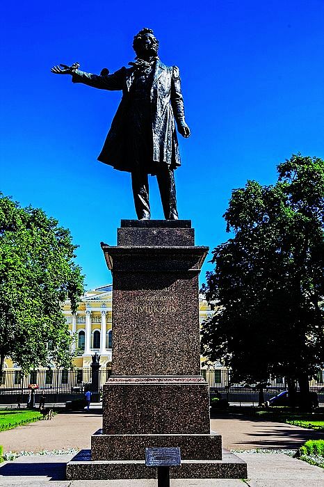14 圣彼得堡俄罗斯博物馆前艺术广场上的普希金塑像。诗人站在高高的花岗石基座上,神情严肃,昂首眺望远方。这座塑像是1957年为纪念诗人逝世120周年而建的